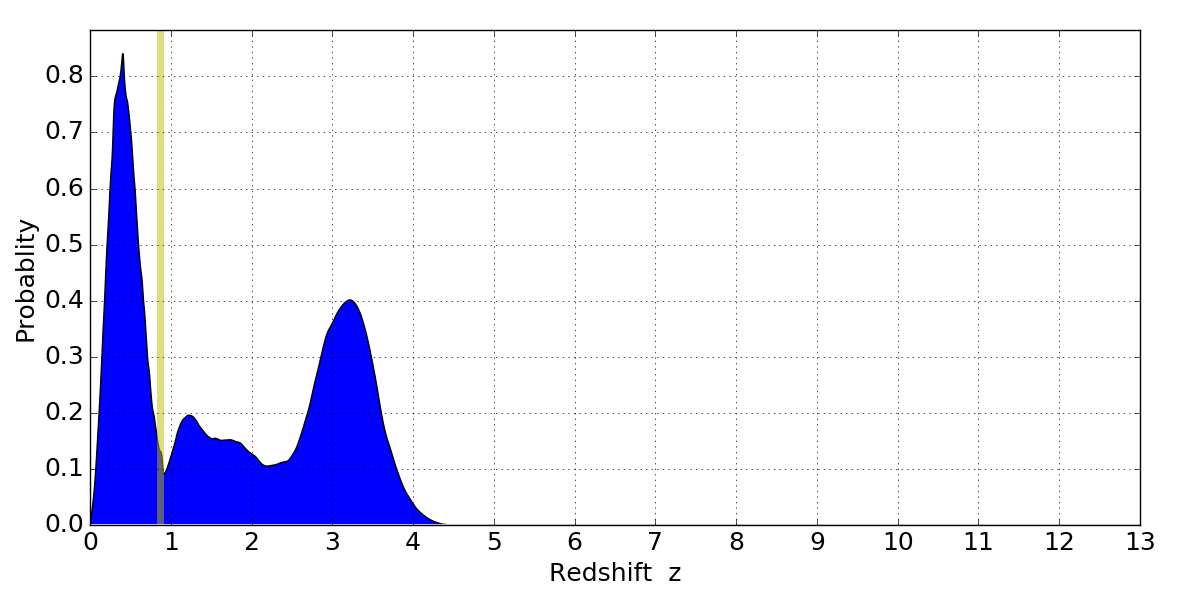 In P(z) plots: Yellow lines mark the cluster redshift z = 0.870,