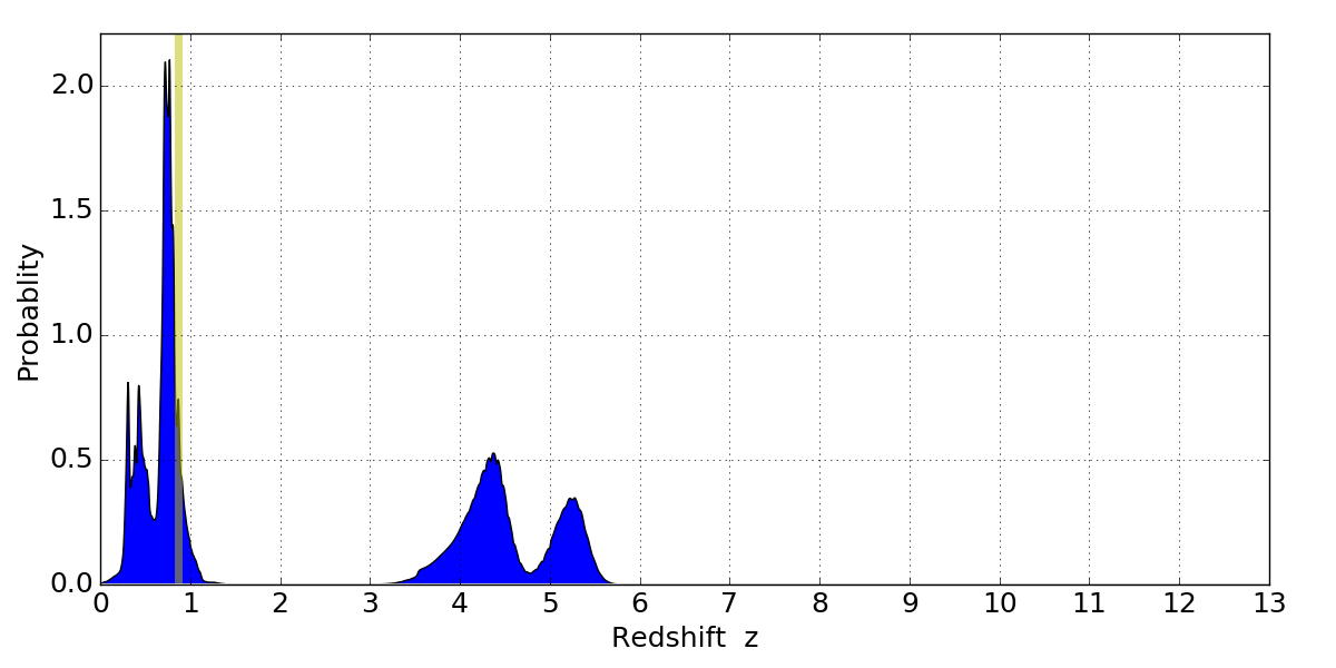 In P(z) plots: Yellow lines mark the cluster redshift z = 0.870,
