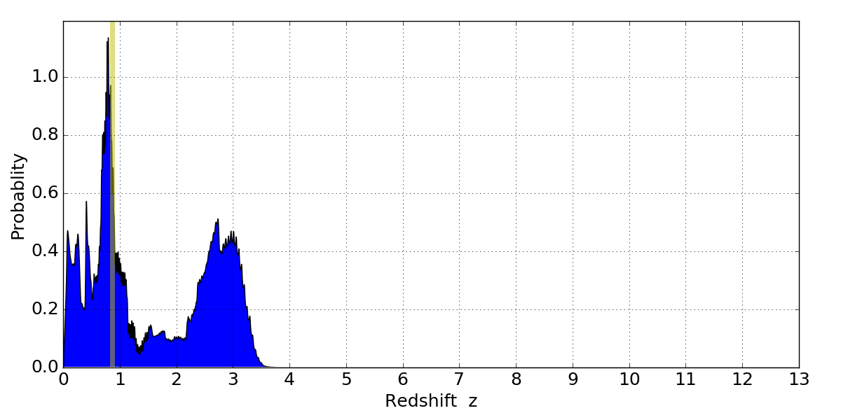 In P(z) plots: Yellow lines mark the cluster redshift z = 0.870,