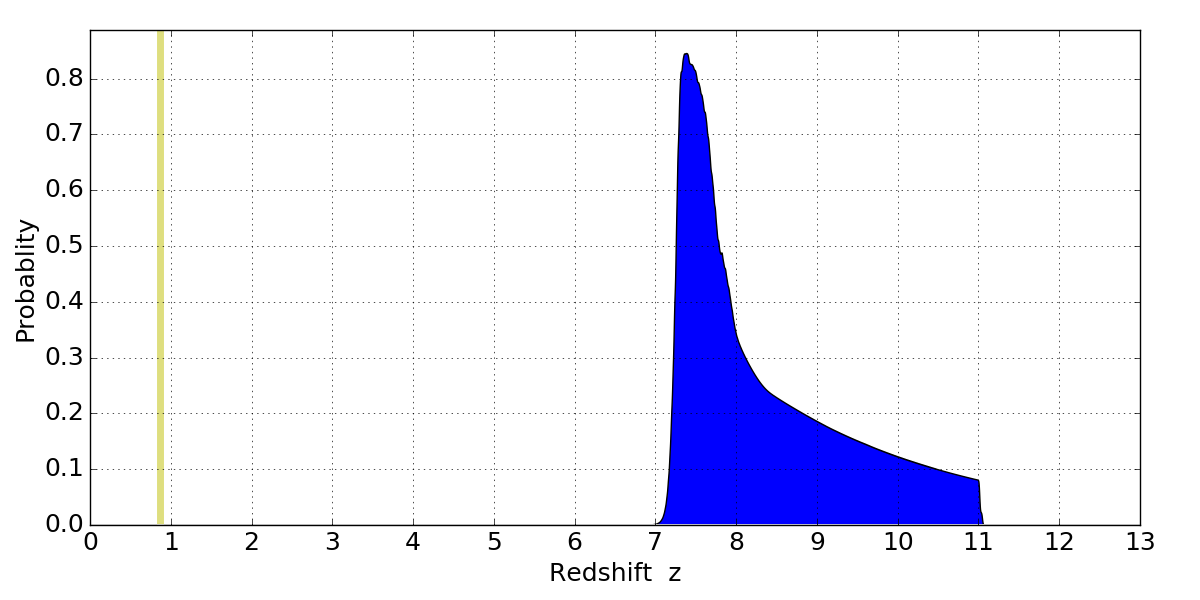 In P(z) plots: Yellow lines mark the cluster redshift z = 0.870,
