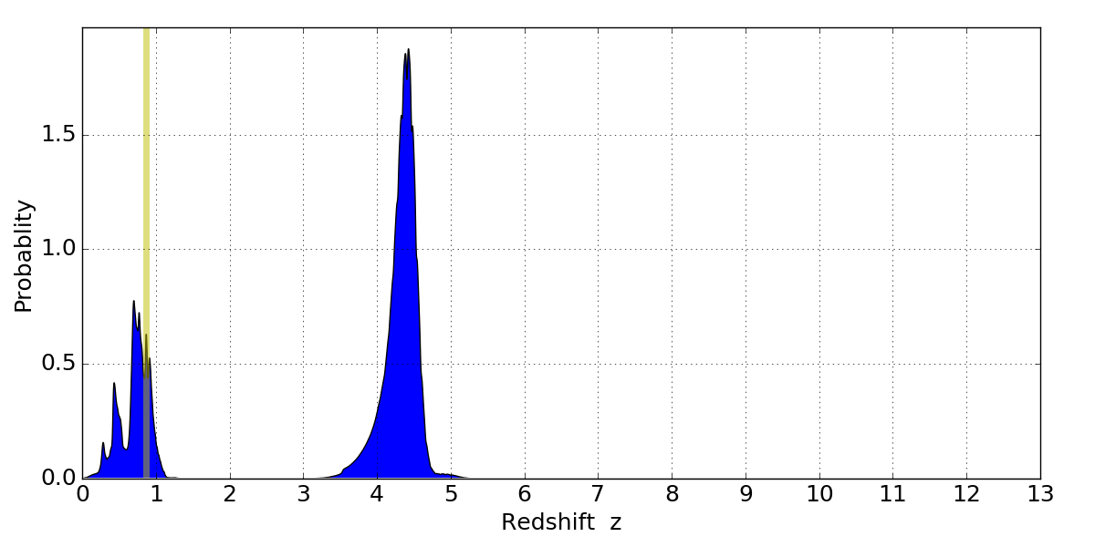 In P(z) plots: Yellow lines mark the cluster redshift z = 0.870,