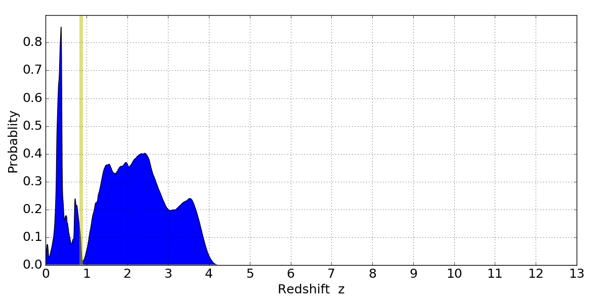 In P(z) plots: Yellow lines mark the cluster redshift z = 0.870,