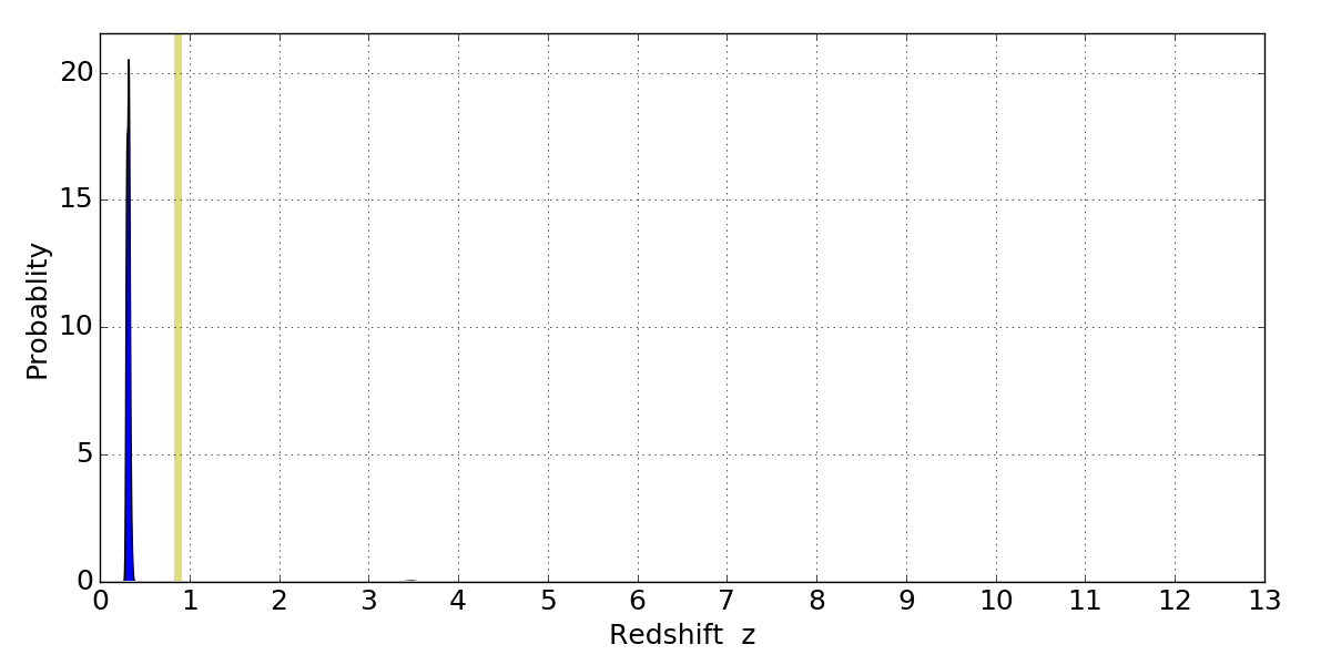 In P(z) plots: Yellow lines mark the cluster redshift z = 0.870,