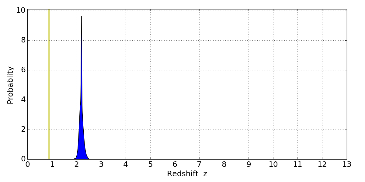 In P(z) plots: Yellow lines mark the cluster redshift z = 0.870,