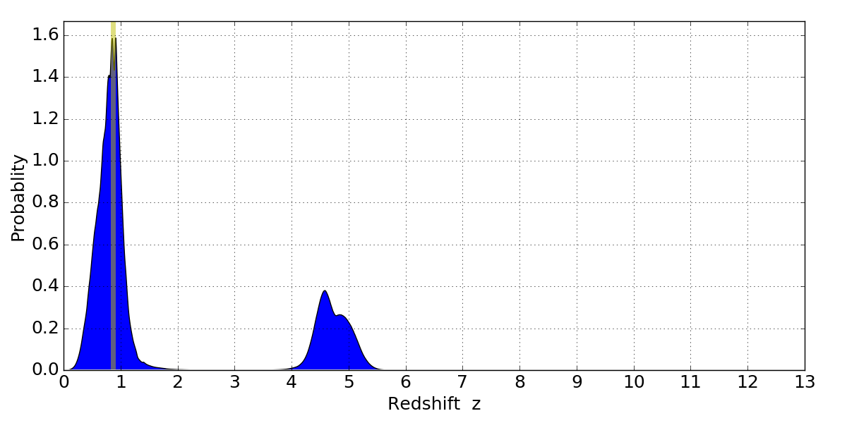 In P(z) plots: Yellow lines mark the cluster redshift z = 0.870,