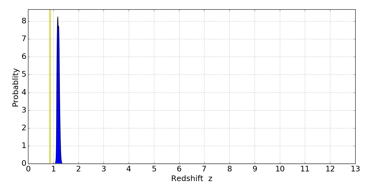 In P(z) plots: Yellow lines mark the cluster redshift z = 0.870,