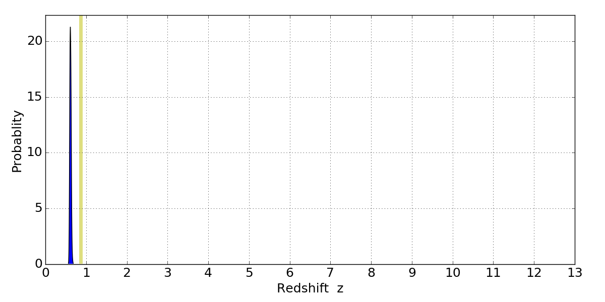In P(z) plots: Yellow lines mark the cluster redshift z = 0.870,