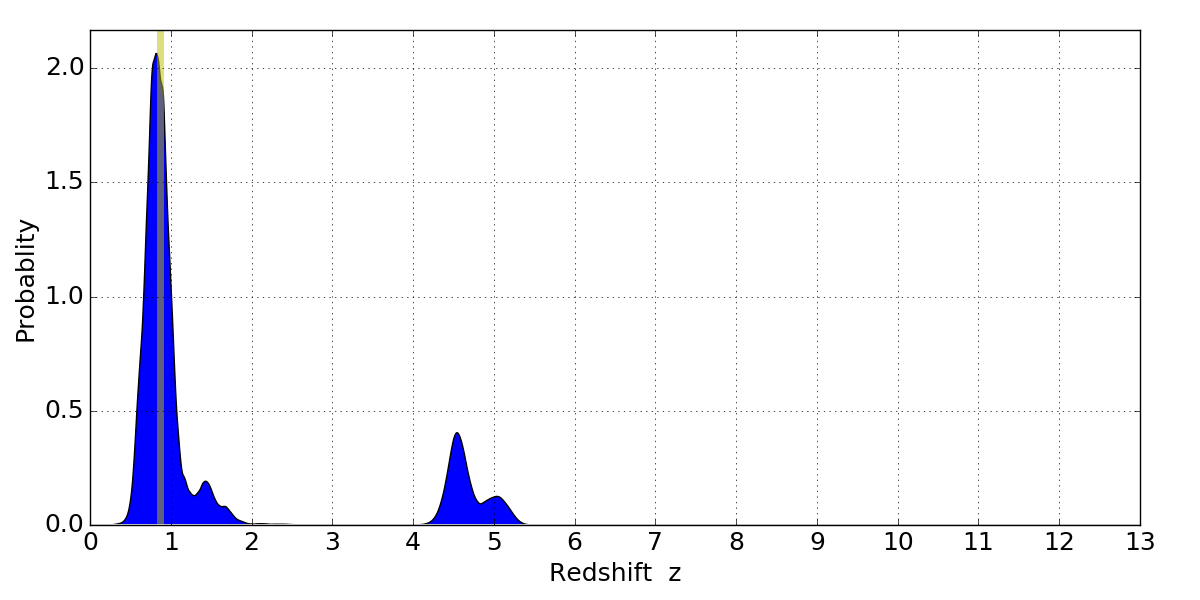 In P(z) plots: Yellow lines mark the cluster redshift z = 0.870,