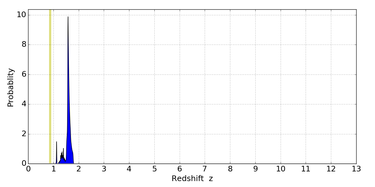 In P(z) plots: Yellow lines mark the cluster redshift z = 0.870,