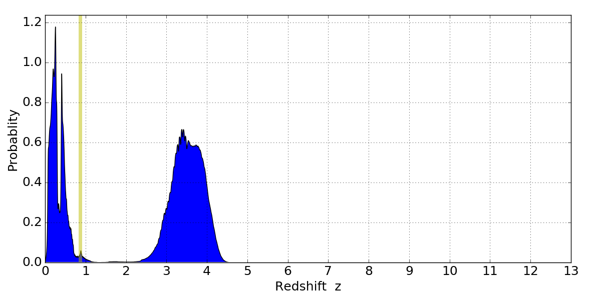 In P(z) plots: Yellow lines mark the cluster redshift z = 0.870,