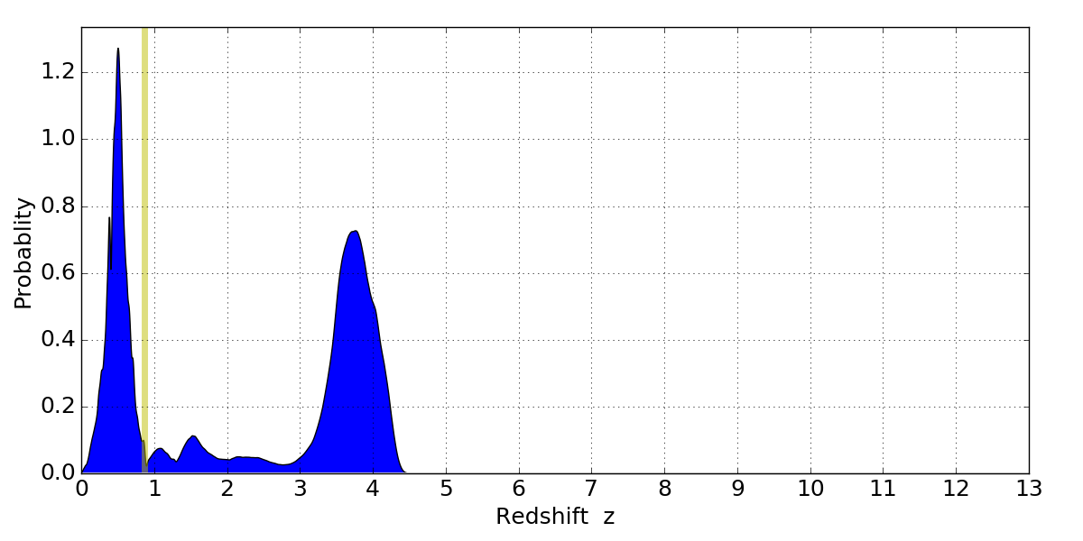 In P(z) plots: Yellow lines mark the cluster redshift z = 0.870,