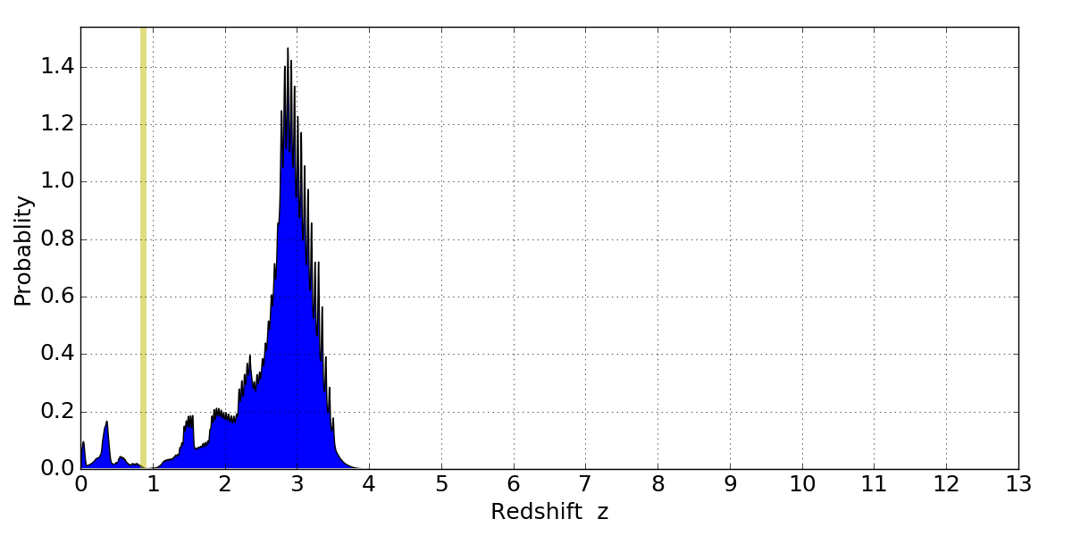 In P(z) plots: Yellow lines mark the cluster redshift z = 0.870,