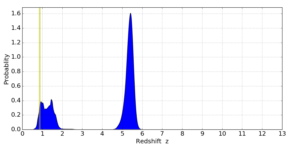 In P(z) plots: Yellow lines mark the cluster redshift z = 0.870,