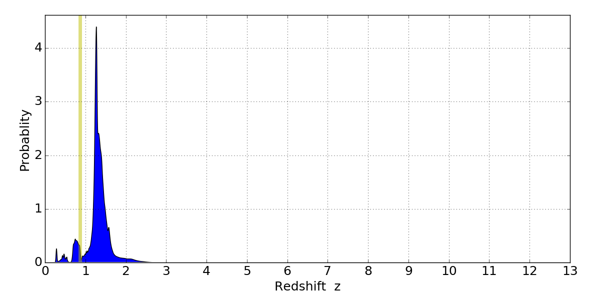 In P(z) plots: Yellow lines mark the cluster redshift z = 0.870,