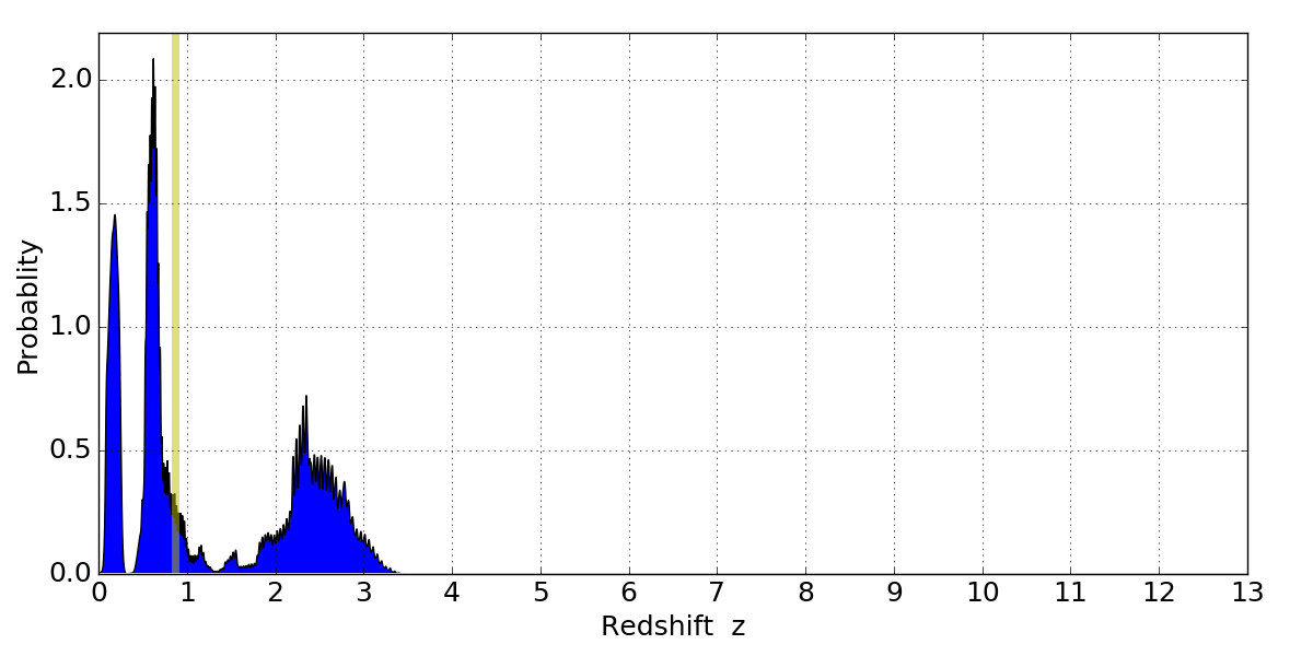 In P(z) plots: Yellow lines mark the cluster redshift z = 0.870,