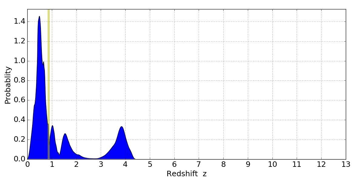 In P(z) plots: Yellow lines mark the cluster redshift z = 0.870,
