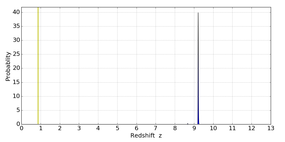 In P(z) plots: Yellow lines mark the cluster redshift z = 0.870,