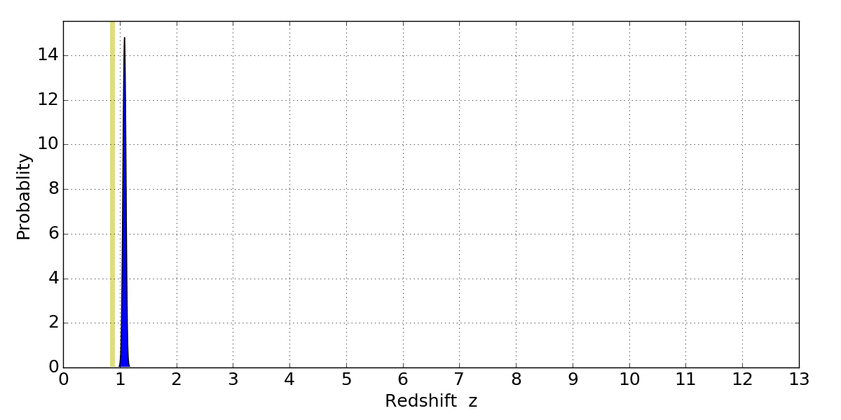 In P(z) plots: Yellow lines mark the cluster redshift z = 0.870,