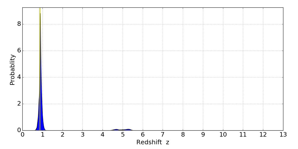 In P(z) plots: Yellow lines mark the cluster redshift z = 0.870,