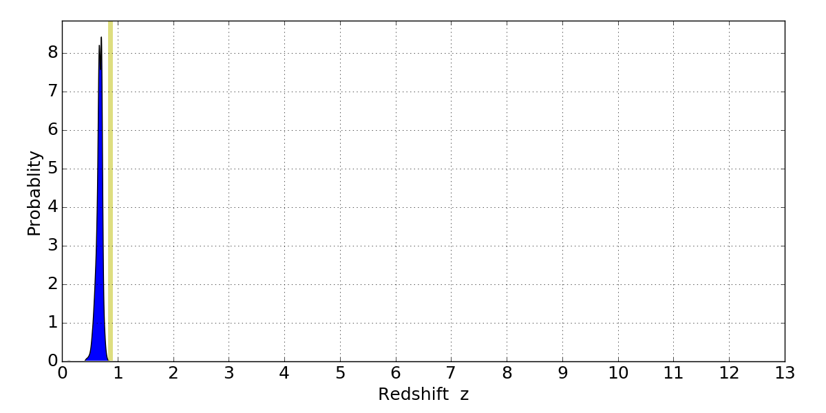In P(z) plots: Yellow lines mark the cluster redshift z = 0.870,
