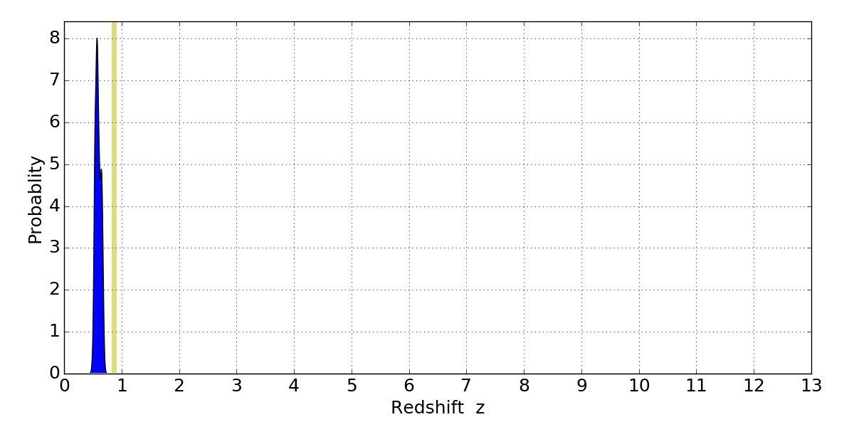 In P(z) plots: Yellow lines mark the cluster redshift z = 0.870,