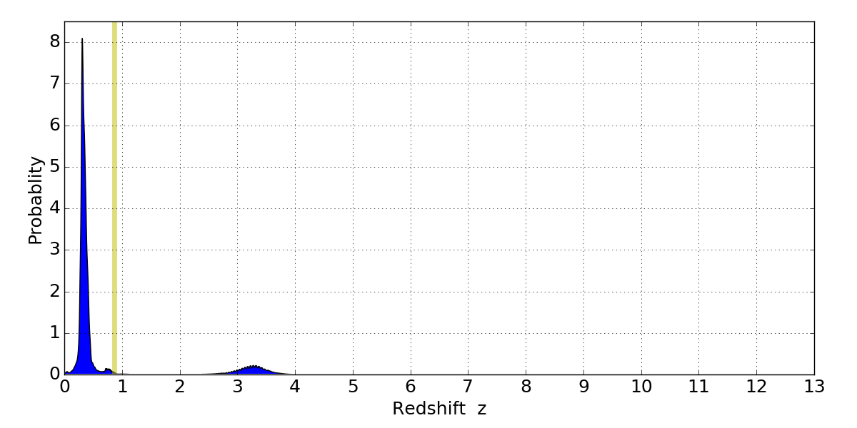 In P(z) plots: Yellow lines mark the cluster redshift z = 0.870,