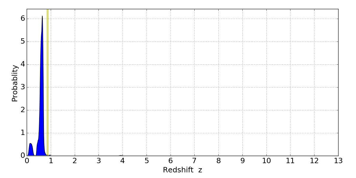In P(z) plots: Yellow lines mark the cluster redshift z = 0.870,