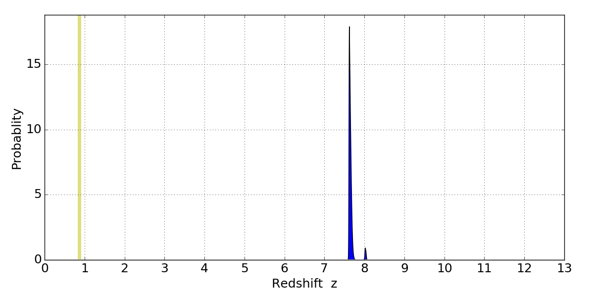 In P(z) plots: Yellow lines mark the cluster redshift z = 0.870,