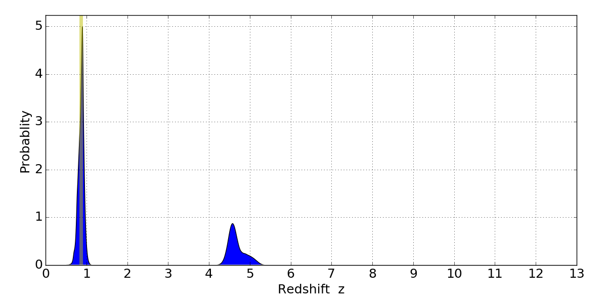 In P(z) plots: Yellow lines mark the cluster redshift z = 0.870,