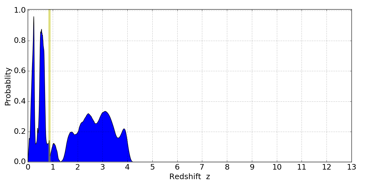 In P(z) plots: Yellow lines mark the cluster redshift z = 0.870,