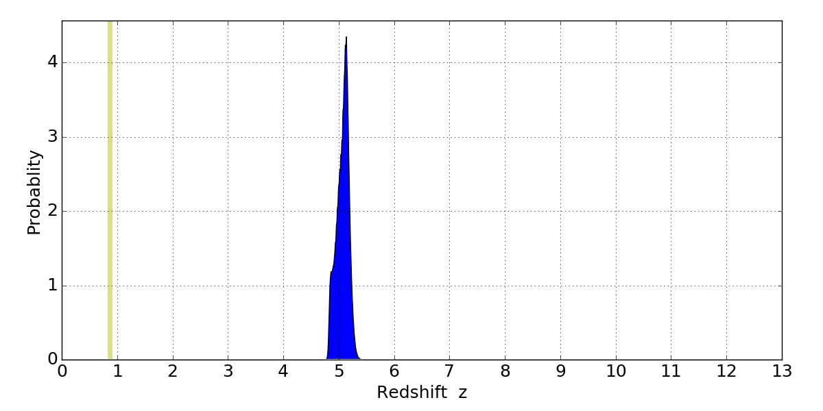 In P(z) plots: Yellow lines mark the cluster redshift z = 0.870,