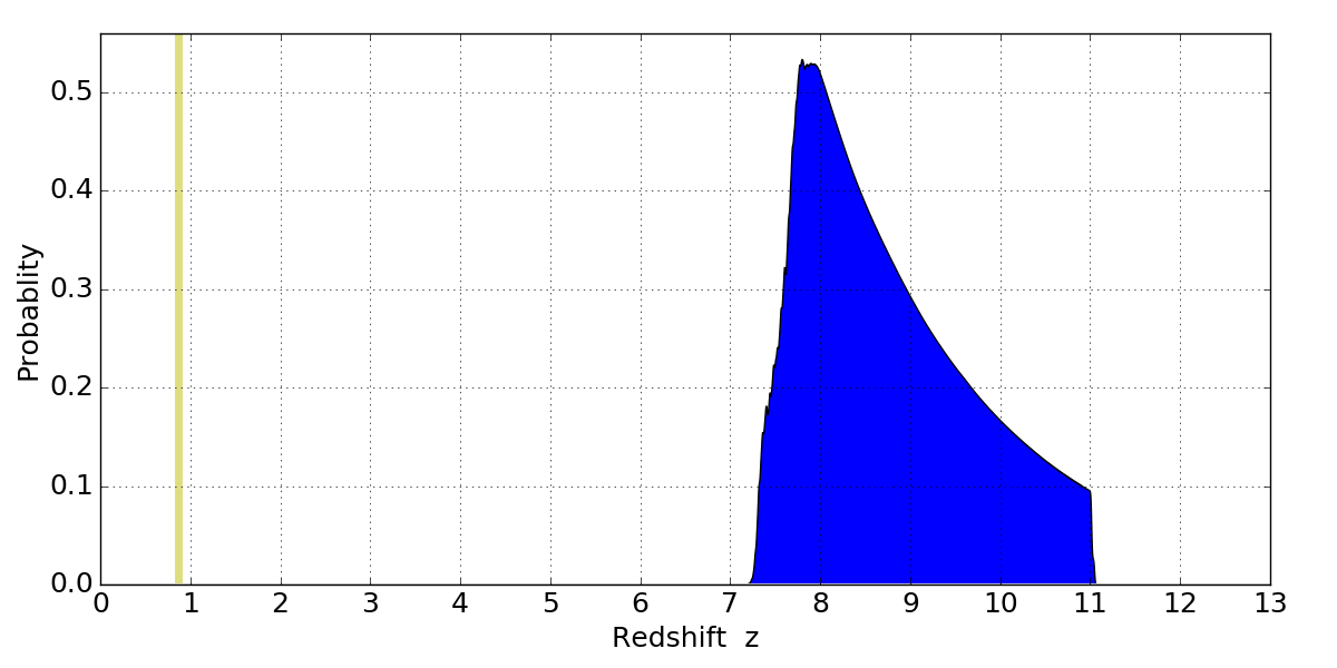 In P(z) plots: Yellow lines mark the cluster redshift z = 0.870,