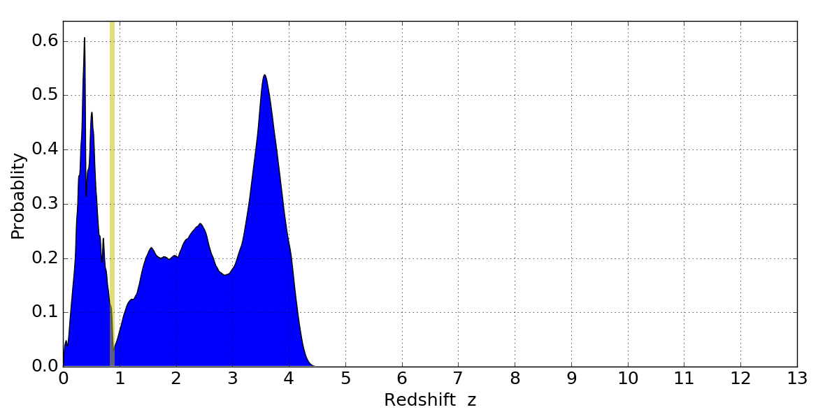 In P(z) plots: Yellow lines mark the cluster redshift z = 0.870,