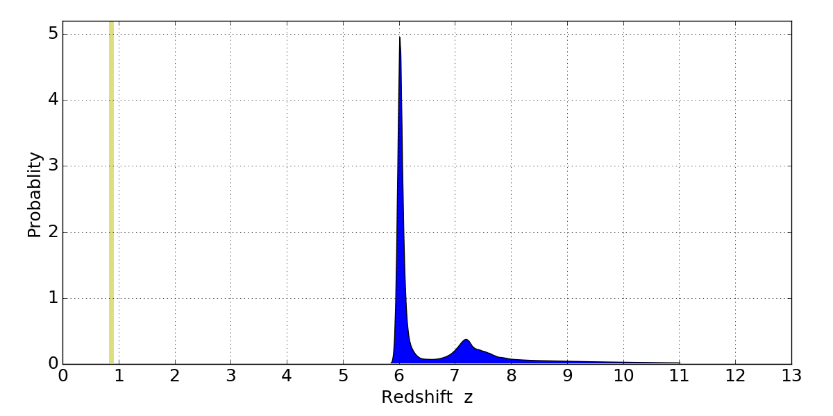 In P(z) plots: Yellow lines mark the cluster redshift z = 0.870,