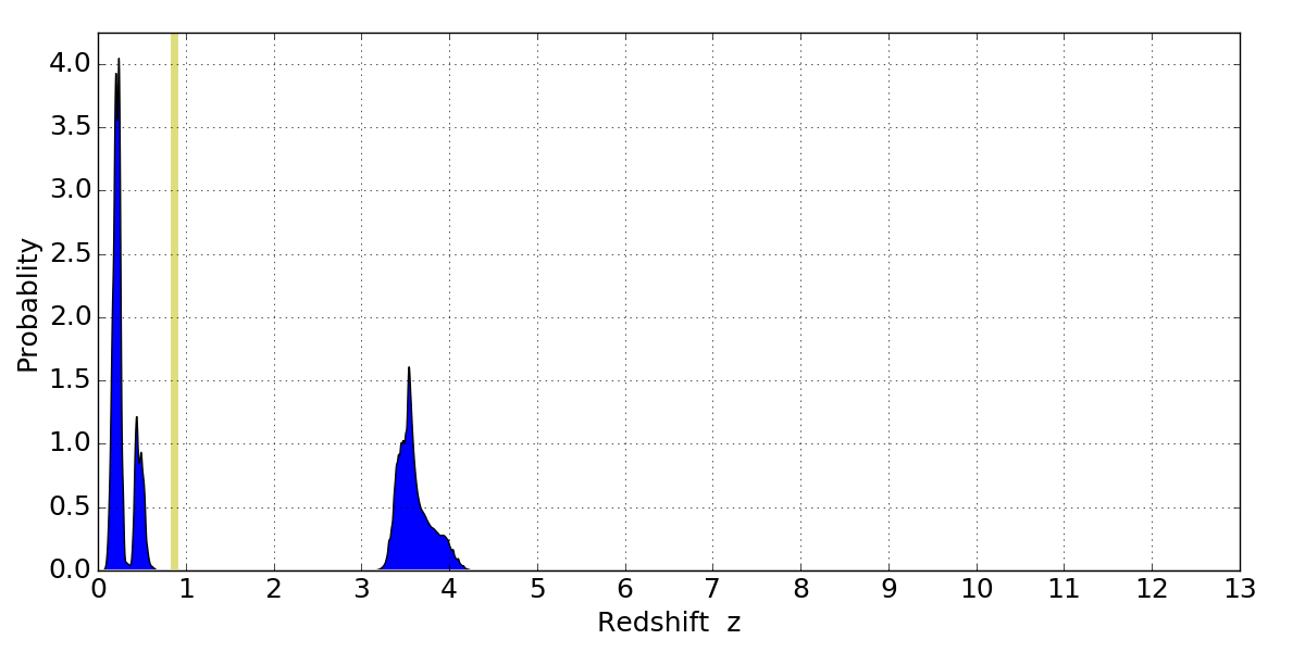 In P(z) plots: Yellow lines mark the cluster redshift z = 0.870,