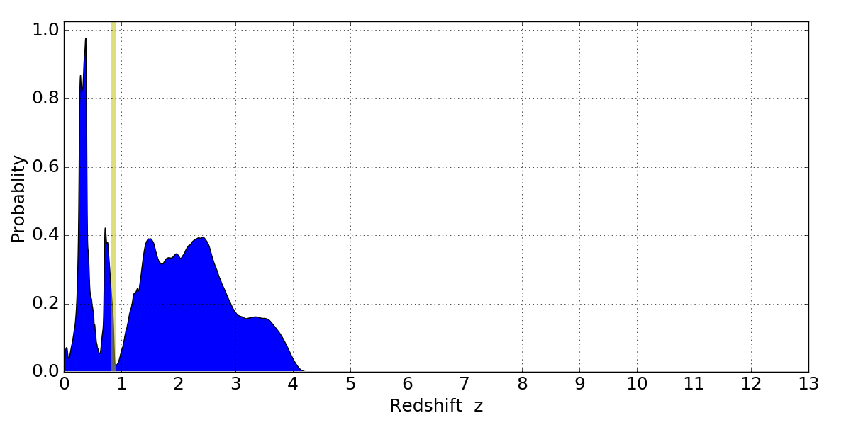 In P(z) plots: Yellow lines mark the cluster redshift z = 0.870,
