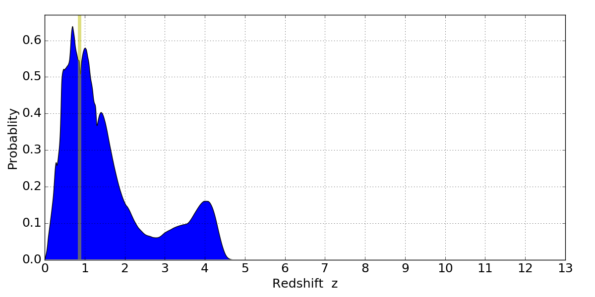 In P(z) plots: Yellow lines mark the cluster redshift z = 0.870,