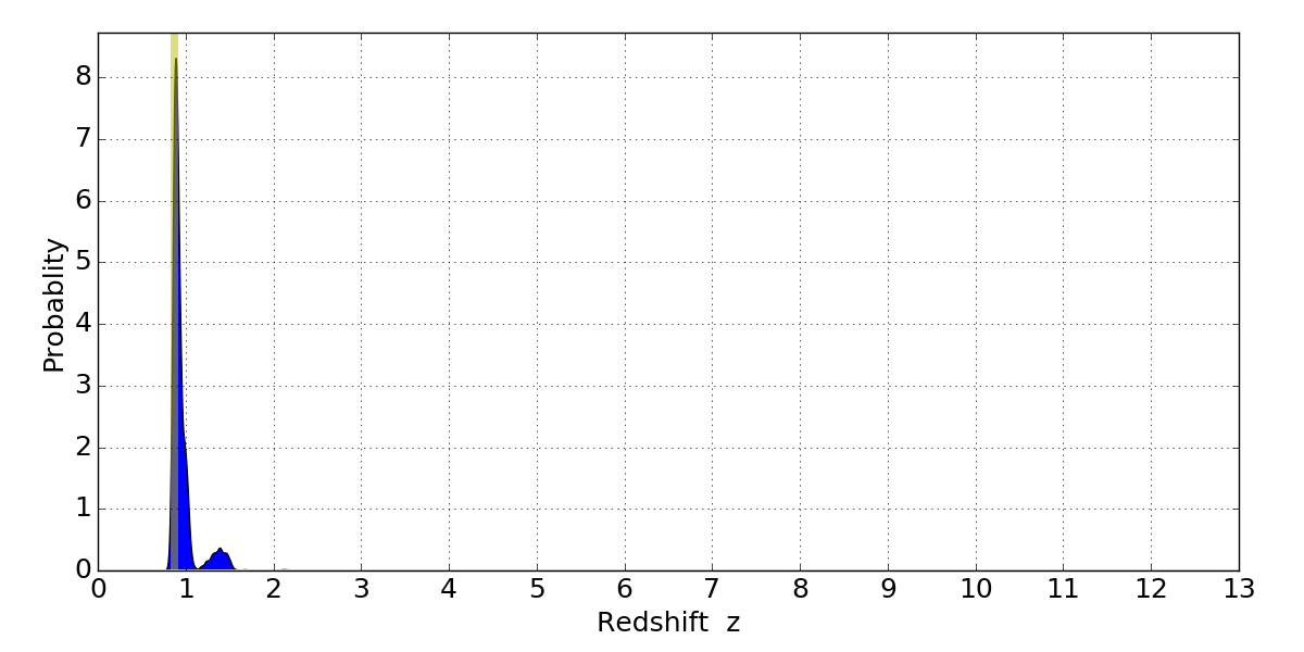 In P(z) plots: Yellow lines mark the cluster redshift z = 0.870,