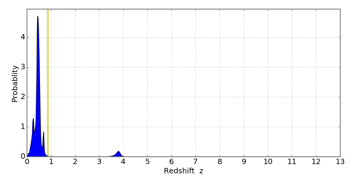 In P(z) plots: Yellow lines mark the cluster redshift z = 0.870,