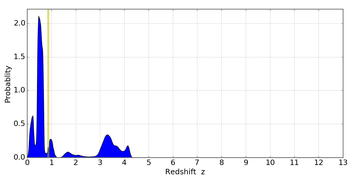 In P(z) plots: Yellow lines mark the cluster redshift z = 0.870,