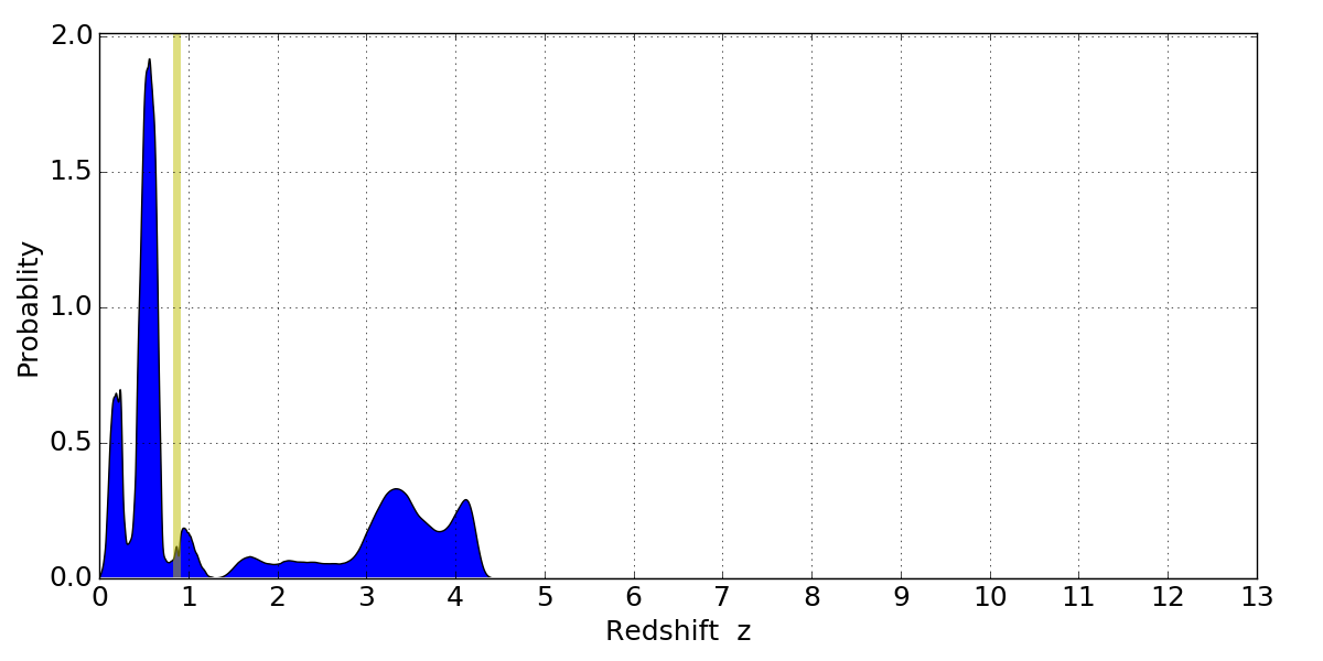 In P(z) plots: Yellow lines mark the cluster redshift z = 0.870,