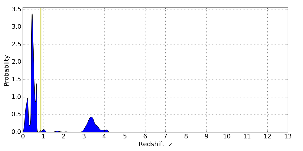 In P(z) plots: Yellow lines mark the cluster redshift z = 0.870,