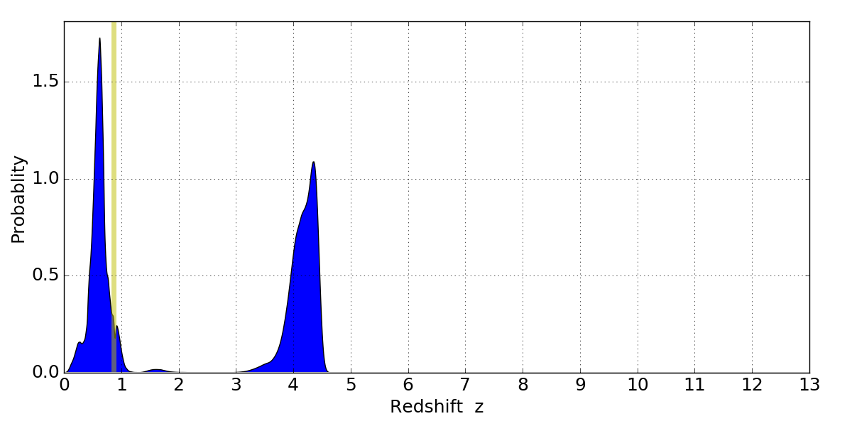 In P(z) plots: Yellow lines mark the cluster redshift z = 0.870,