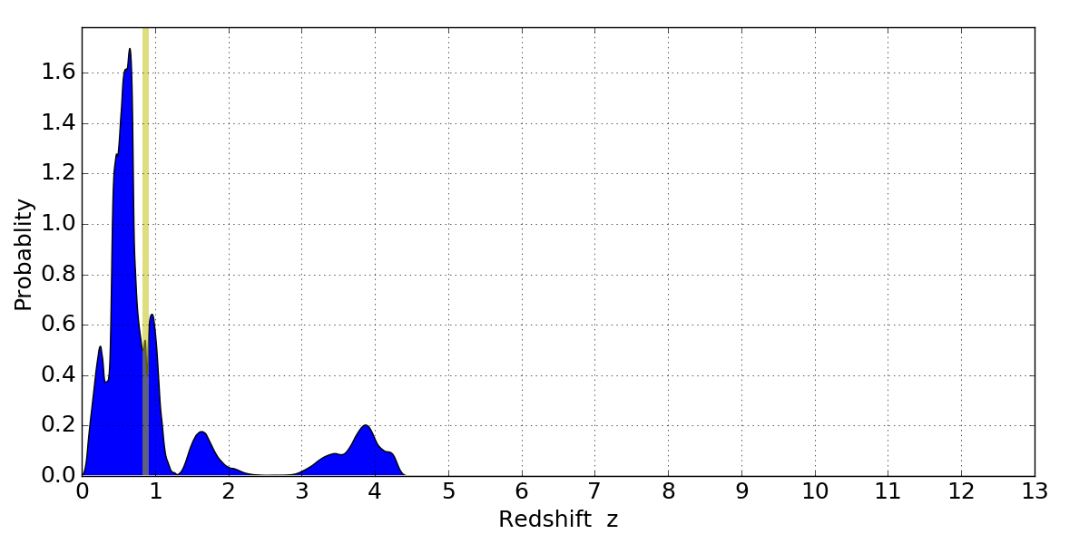 In P(z) plots: Yellow lines mark the cluster redshift z = 0.870,