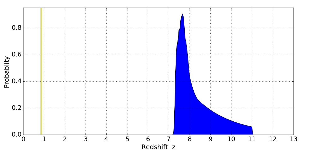 In P(z) plots: Yellow lines mark the cluster redshift z = 0.870,