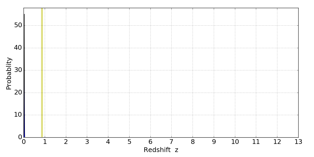 In P(z) plots: Yellow lines mark the cluster redshift z = 0.870,