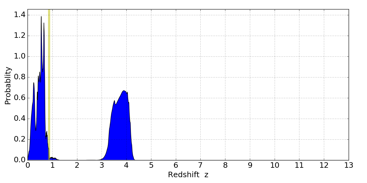 In P(z) plots: Yellow lines mark the cluster redshift z = 0.870,
