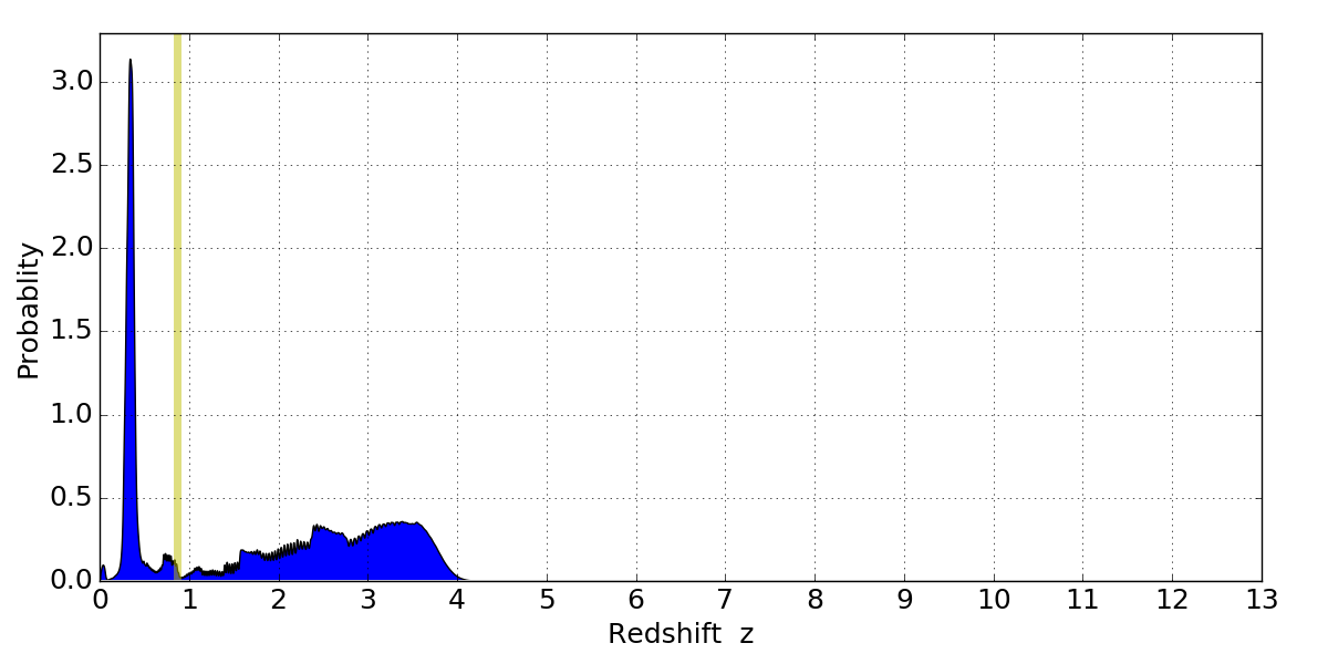 In P(z) plots: Yellow lines mark the cluster redshift z = 0.870,