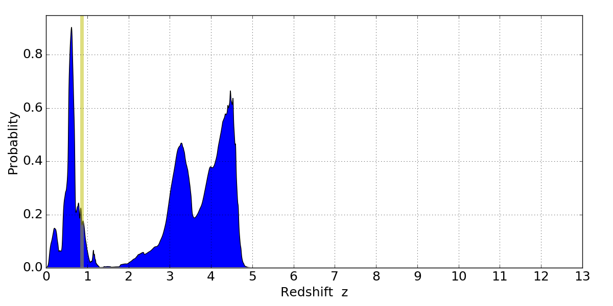 In P(z) plots: Yellow lines mark the cluster redshift z = 0.870,
