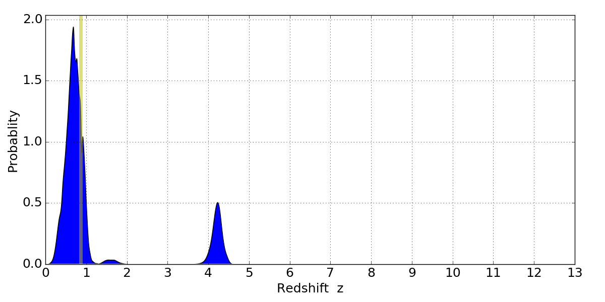 In P(z) plots: Yellow lines mark the cluster redshift z = 0.870,